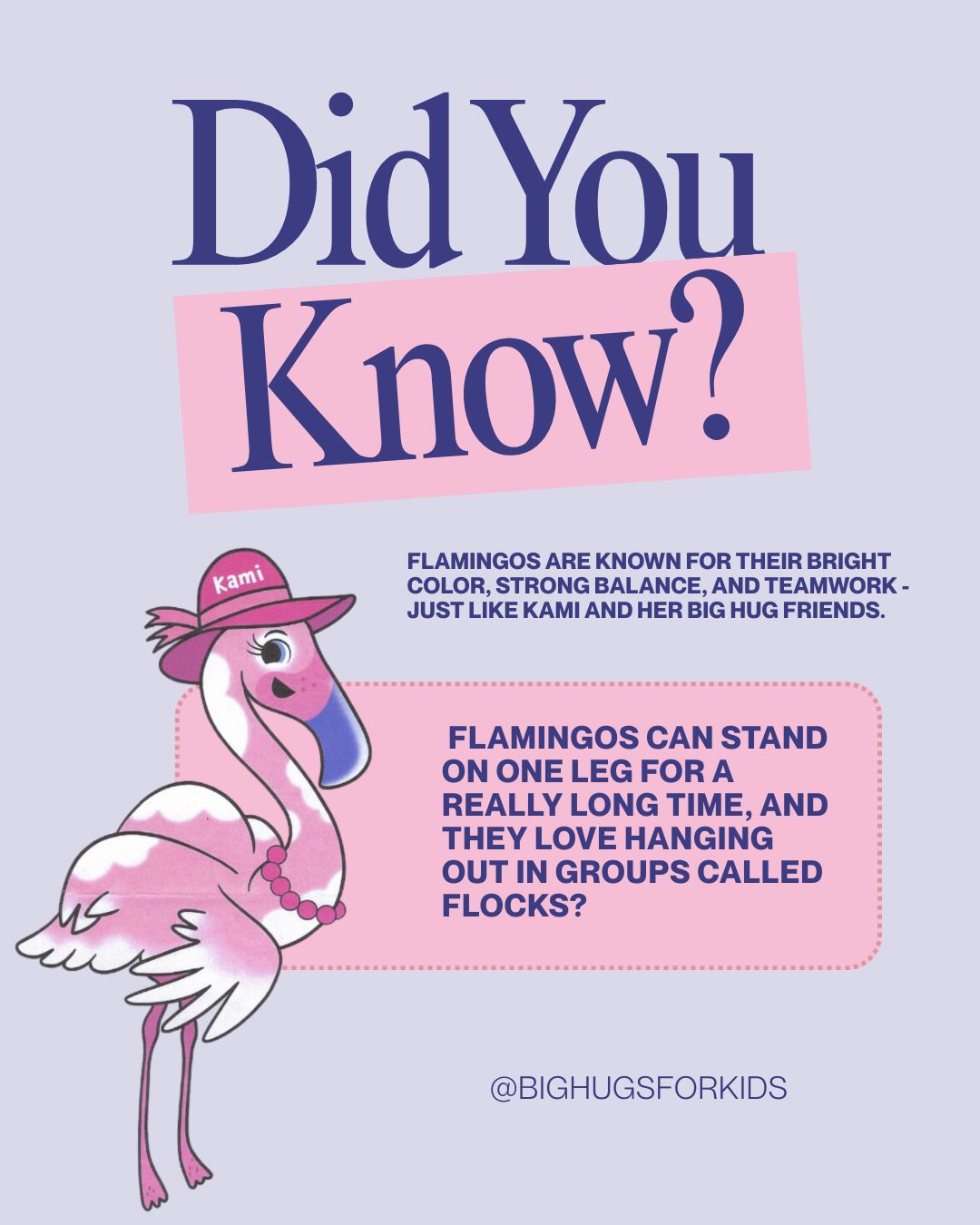Fun Fact Friday! 🎉🦩 Did you know flamingos can stand on one leg for a really long time, and they love hanging out in groups called flocks? Flamingos are known for their bright color, strong balance, and teamwork – just like Kami and her BIG HUG friends. Which flamingo fact is your favorite? Share oneContinue reading “Fun Fact Friday!”
