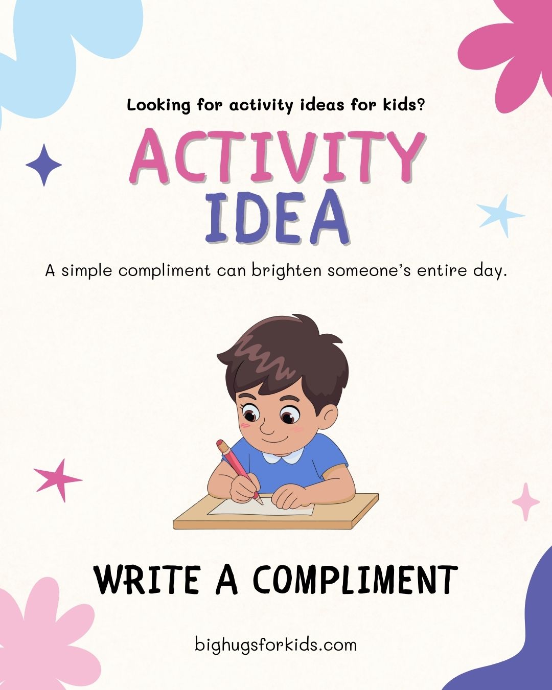 📝 Activity Idea: Write a Compliment A simple compliment can brighten someone’s entire day. Help your child write a kind note to a teacher, grandparent, friend, or family member and watch how powerful a few positive words can be. You can download Kami’s free printable stationery on our website under the Resources tab:https://bighugsforkids.com/resources-quick-tips/ Let’s spreadContinue reading “Activity Idea!”